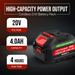 With fast charging capability and extended lifespan, this 4.0Ah battery pack is perfect for demanding applications. It features overcharge, over-discharge, and short-circuit protection, guaranteeing safe and reliable operation. The lightweight yet durable design ensures comfortable handling, making it ideal for drills, saws, grinders, and other cordless tools.